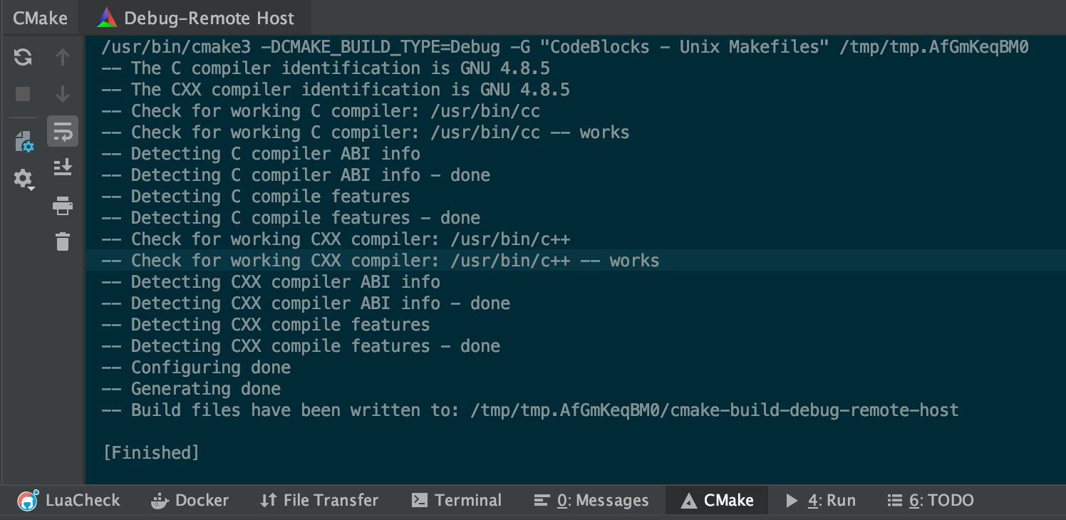 창이 닫히면 백그라운드로 CLion과 Docker가 연동되고 ‘CMake’탭을 열어보면 아래와 같이 출력될 것이다.