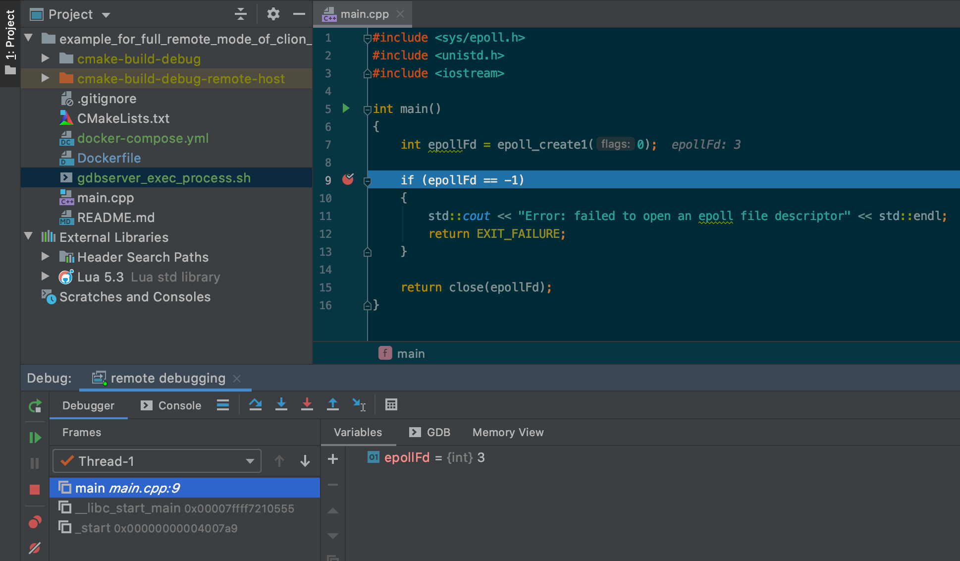 Dockerfile, docker-compose.yml 그리고 CMake의 build type, compile debug option, release option과 같은 세부 사항이나 GDB Server의 옵션 등과 기타 디버그 설정 등도 여기서 모두 설명하면 너무 길어지므로 생략하고, 리모트 디버그 연동만 정리하겠다.
