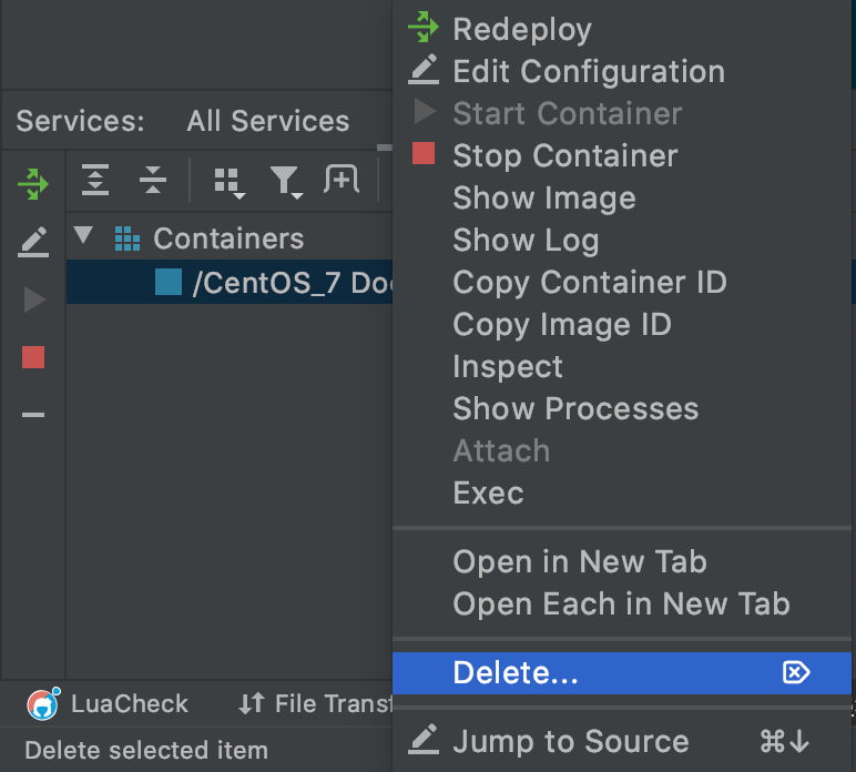 파일이 준비되었으면, 아래와 같이 ‘Run/Debug Configurations’에서 이전에 설정했던 Docker/CentOS_7 설정을 삭제한다.