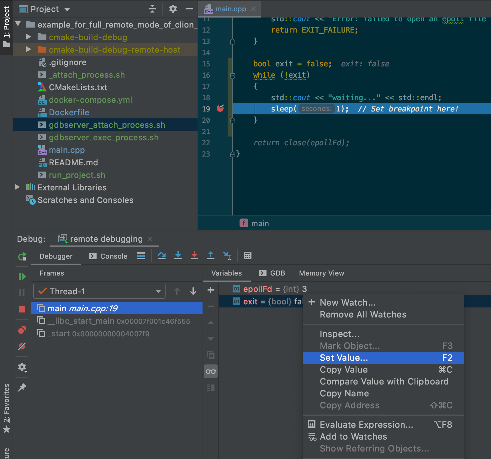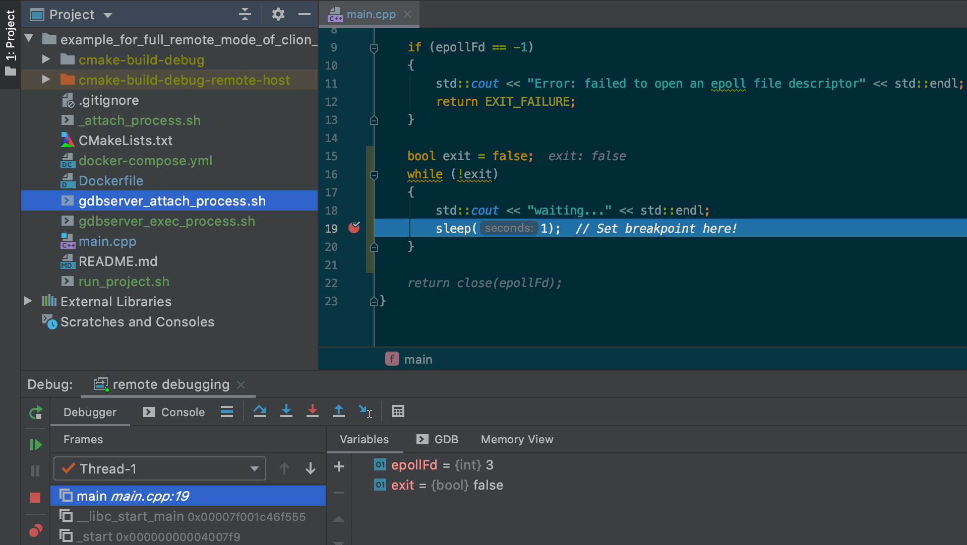 ‘main.cpp’에서 ‘// Set breakpoint here!’ 라인에 Breakpoint를 설정하고, ‘remote debugging’를 실행하면, 아래와 같이 Breakpoint가 잡힌다.