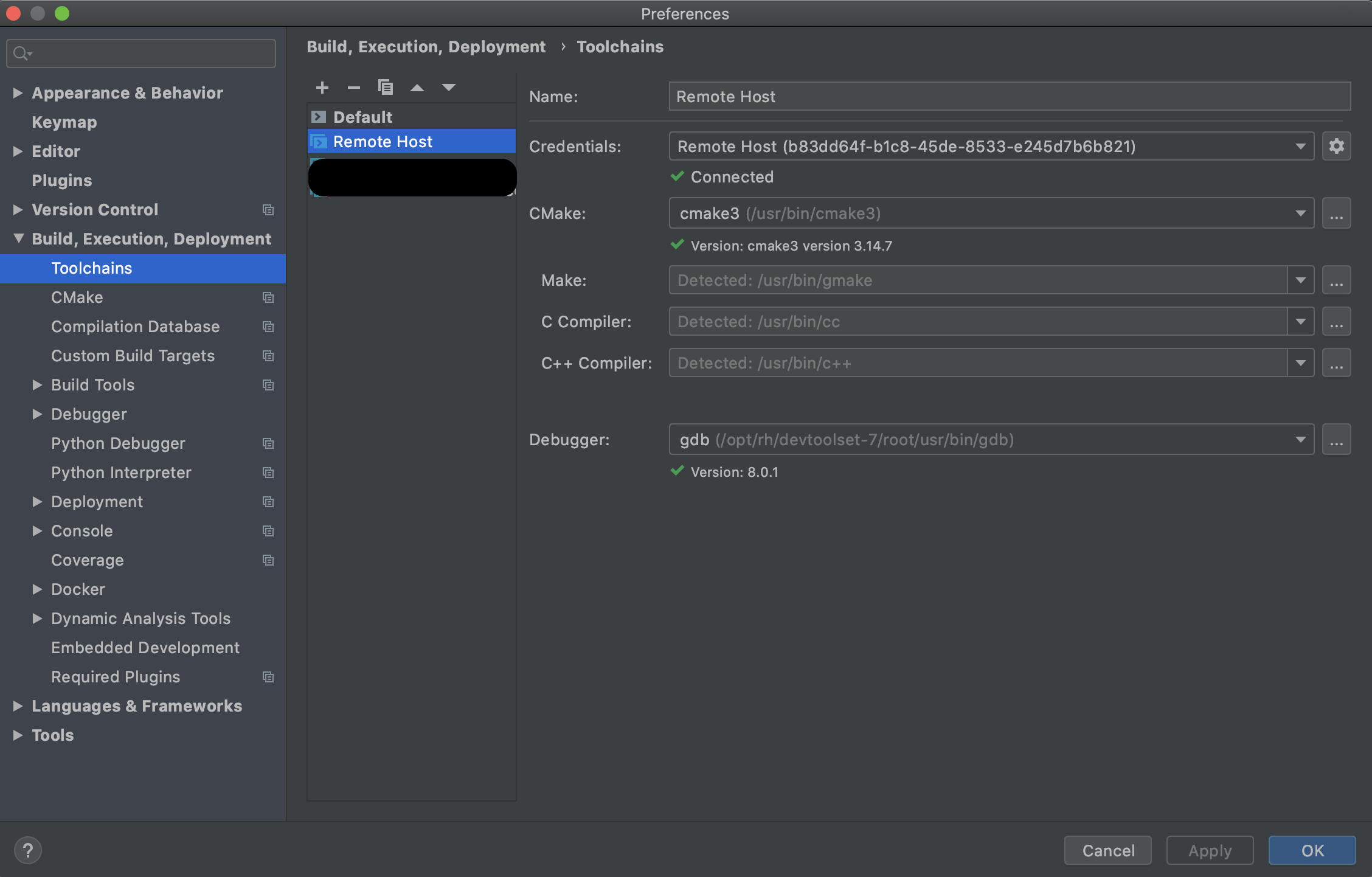 그러면, gdb 버전이 8로 인식된다. 참고로, CLion의 버전을 2020.1로 올렸더니 Toolchains 설정의 Credentials가 콤보 박스로 바뀌었고, 상세 설정에는 그동안 설정했던 Credentials 설정이 리스트 업되는 기능이 추가되었다.