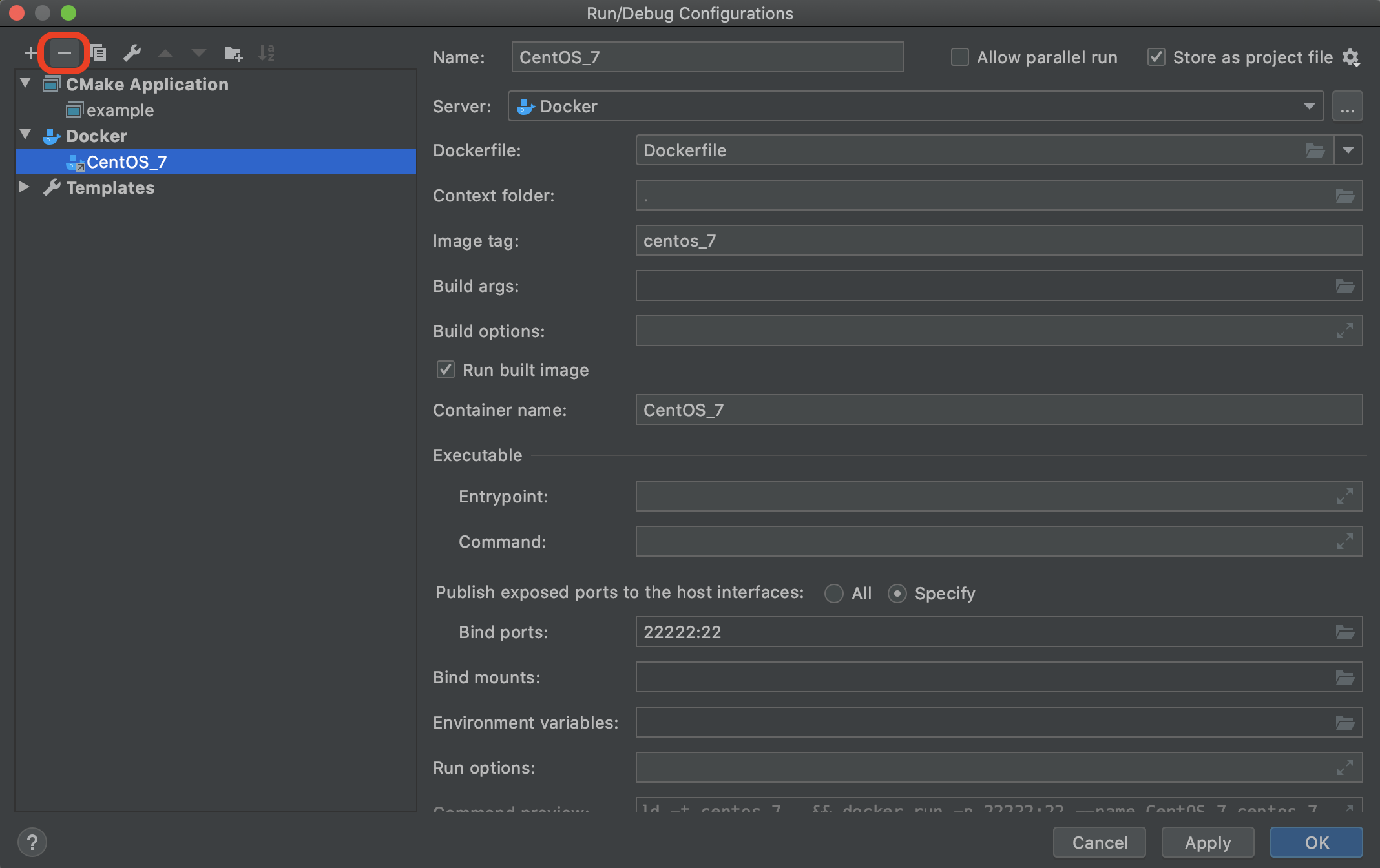 파일이 준비되었으면, 아래와 같이 ‘Run/Debug Configurations’에서 이전에 설정했던 Docker/CentOS_7 설정을 삭제한다.