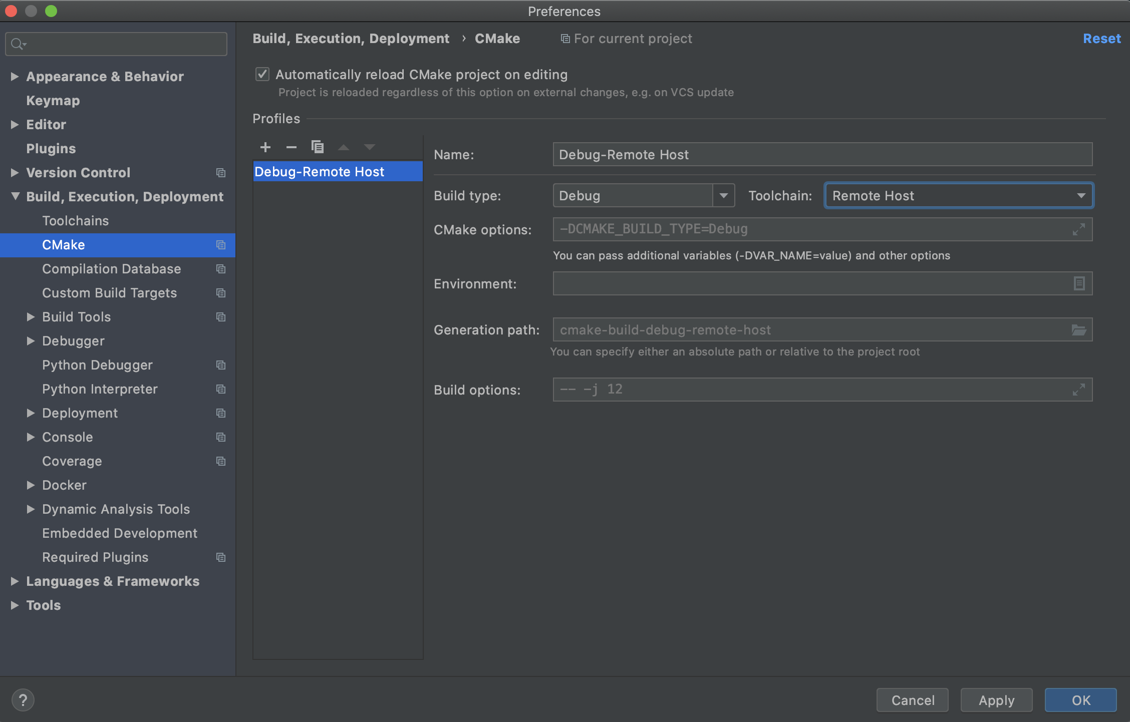 CMake 설정이 ‘Remote Host’로 되어있는지 확인한다.