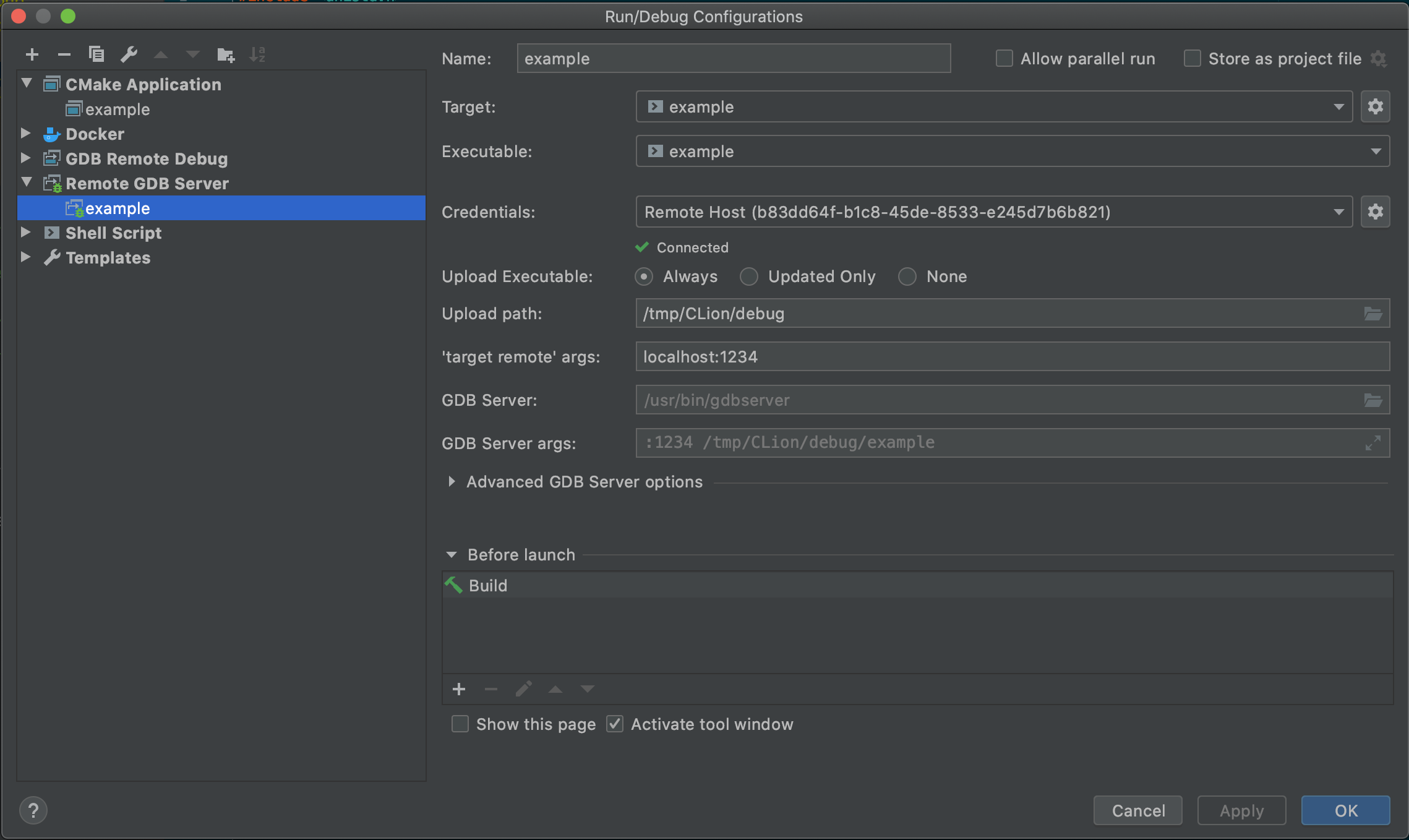 Shared Library이거나 실행 조건에 외부 종속이 많아서 복잡한 경우 등 몇 가지 이유로 CLion에서 프로젝트를 직접 실행할 수 없다면, 추가 작업이 필요하다. 'Run/Debug Configurations'에 'GDB Remote Debug' 설정을 하기 위해서 몇 가지 정보가 필요하다.