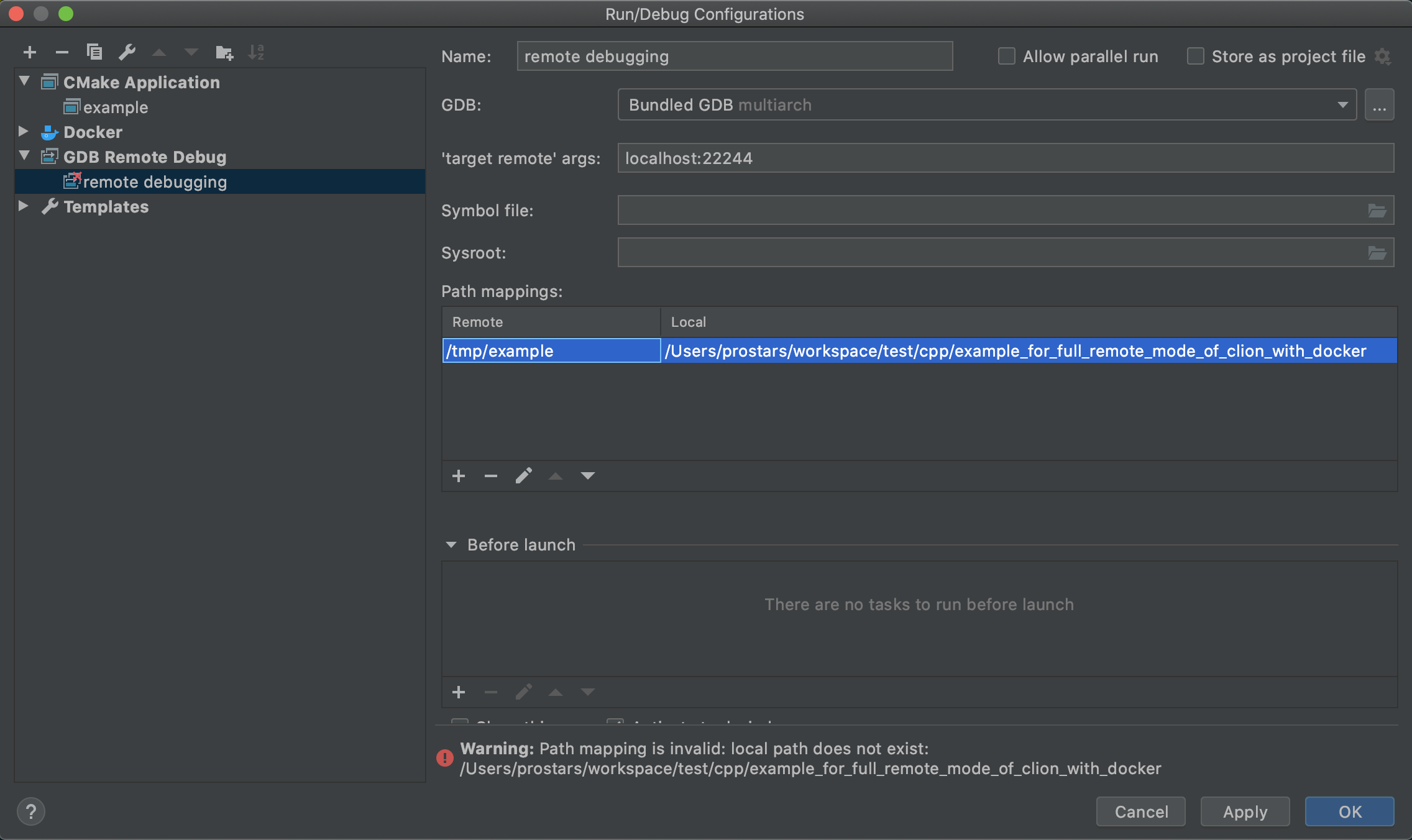 아래 스크린샷에서 'target remote' arg 설정에 포트 번호가 기본값으로 되어 있는데, 컨테이너에서 gdbserver 용도로 노출한 22244로 설정해야 한다. 즉, 'localhost:22244'로 설정해야 한다.