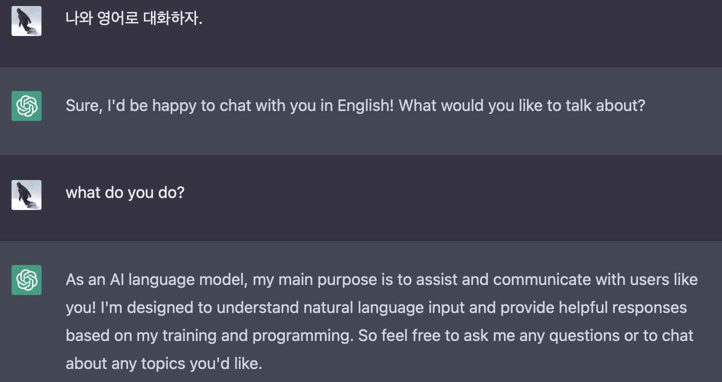일단 기억해야 할 것은 단순하게 요청하면 단순하게 동작한다는 것이다. 간단히 '나와 영어로 대화하자.'라고 요청하면 다음과 비슷한 반응을 보일 것이다.