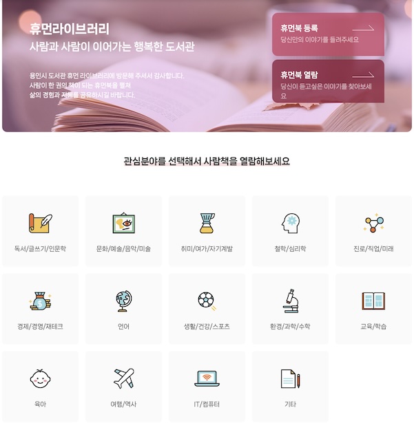 조금은 더 많은 사람들이 이 서비스를 이용했으면 하는 마음에 휴먼북 서비스를 소개하려고 한다. 여기서 소개하는 것은 용인시의 휴먼 라이브러리 서비스다.