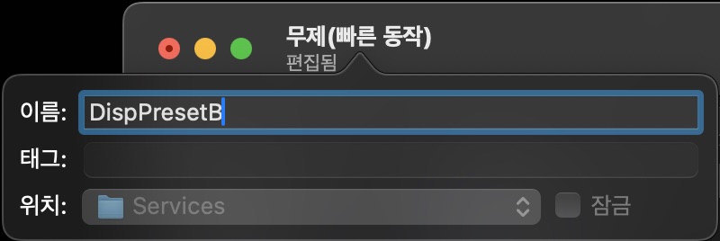 Automator의 파일 메뉴에서 복제를 선택하고 아래와 같이 'DispPresetB’라고 이름을 지정한다.