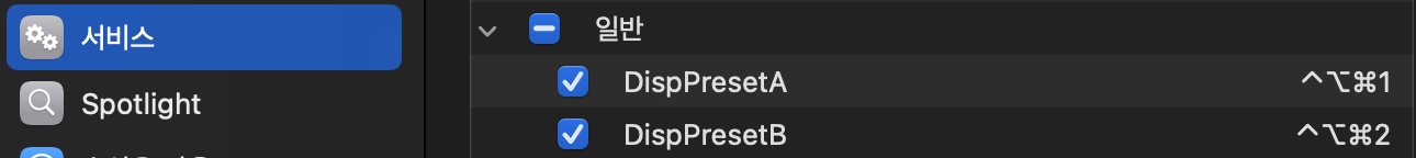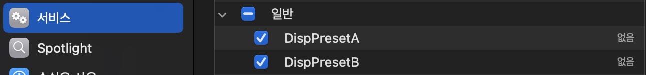 '시스템 설정’의 '키보드’에서 '키보드 단축키...'를 클릭하여 열린 창에서 '서비스’를 선택하고 아래와 같이 '일반' 항목을 펼치면 위에서 생성한 'DispPresetA', 'DispPresetB’가 보인다.