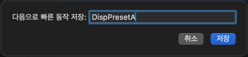 '없음' 부분을 더블 클릭하면 입력창이 열리는데 이때, 사용할 단축키를 누르면 아래와 같이 설정된다. 여기서는 'DispPresetA’에 '^⌥⌘1’를 단축키로 지정하고, 'DispPresetB’에 '^⌥⌘2’를 단축키로 지정한다.
