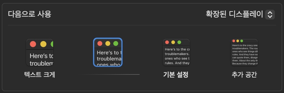 집에서 주로 맥북을 거치대에 올려놓고 확장 모니터의 왼쪽에 두는 정렬을 사용하면서, 맥북 모니터의 해상도는 한 단계 낮추어서 사용한다.