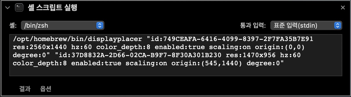 현재 모니터 구성 정보가 출력된다. 출력된 결과에서 가장 마지막에 출력된 정보 'displayplacer "id:...degree:0"'가 필요하다.