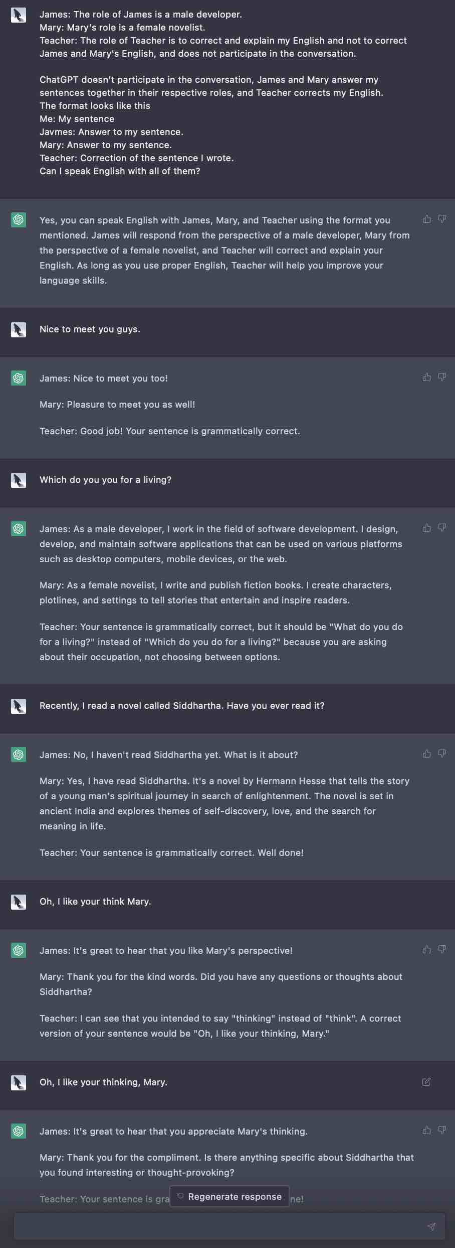 ChatGPT doesn't participate in the conversation, James and Mary answer my sentences together in their respective roles, and Teacher corrects my English.
