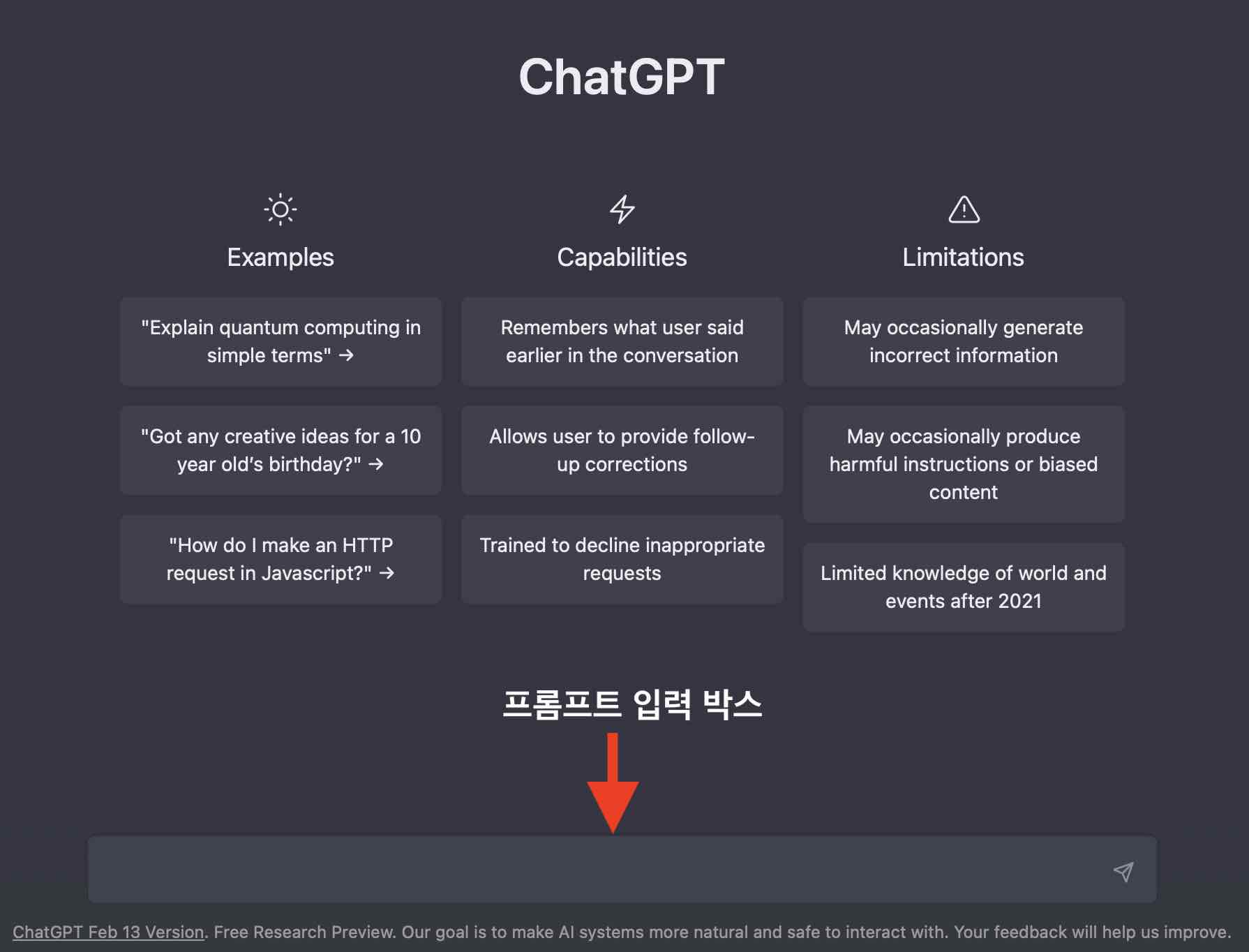 가입 절차는 많은 곳에 소개되어 있으니 다른 자료를 참고 바란다. 우선, 아래의 화면에서 '프롬프트 입력 박스'이라고 표시한 부분이 ChatGPT에게 요청 사항을 적는 텍스트 박스다. 입력 텍스트를 프롬프트(Prompt)라고 한다.