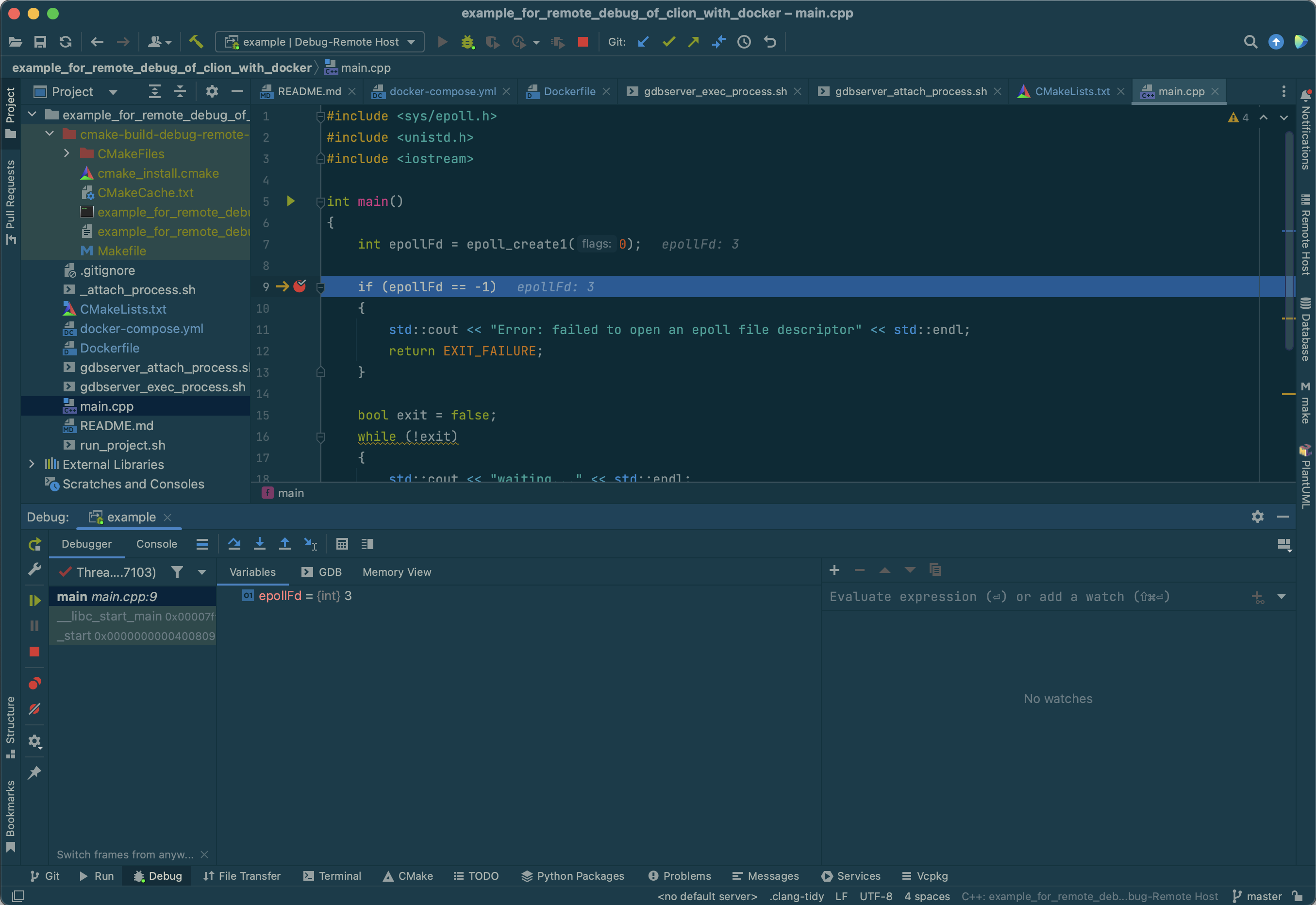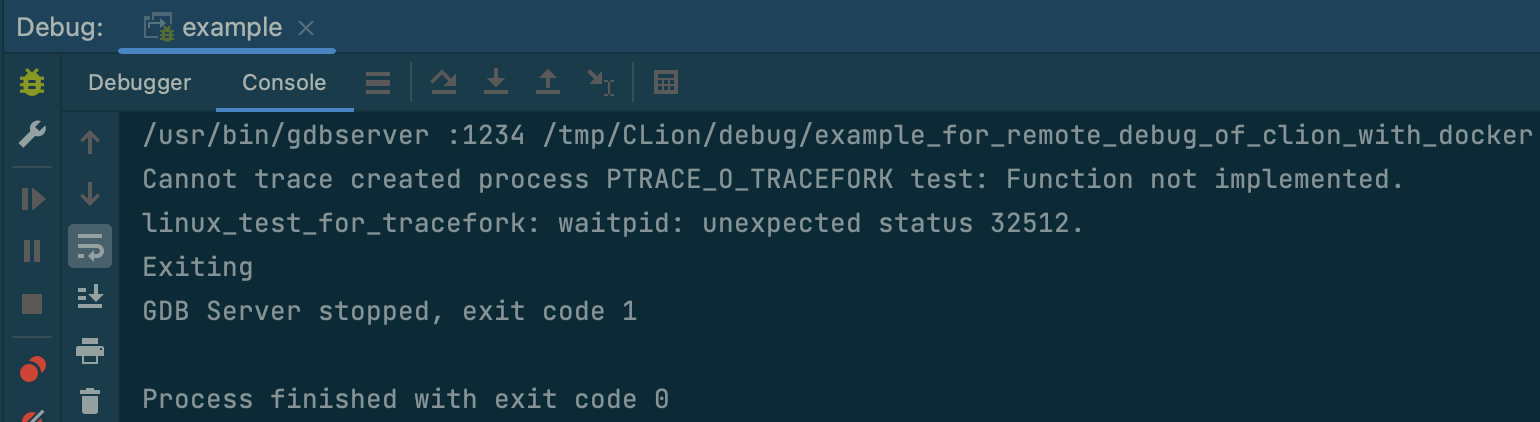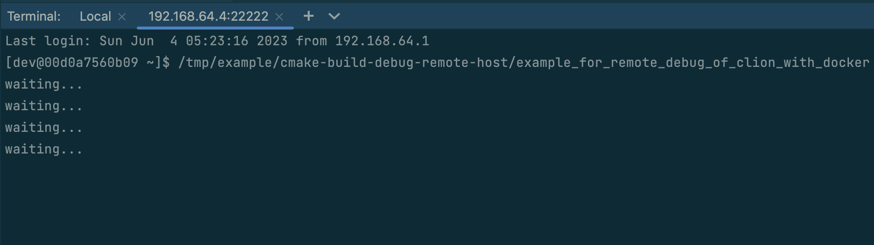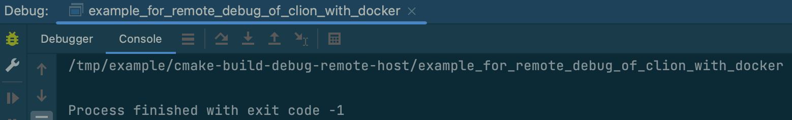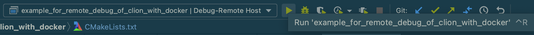CLion 설정이 끝난 상태에서 아래와 같이 'example_for_remote_debug_of_clion_with_docker'을 실행한다.