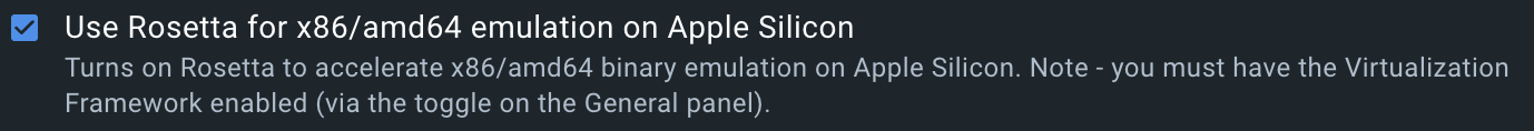 'Docker Desktop For Mac' 최근 버전에는 'Beta features'로 아래와 같이 'Use Rosetta for x86/amd64 emulation on Apple Silicon' 설정이 있다.