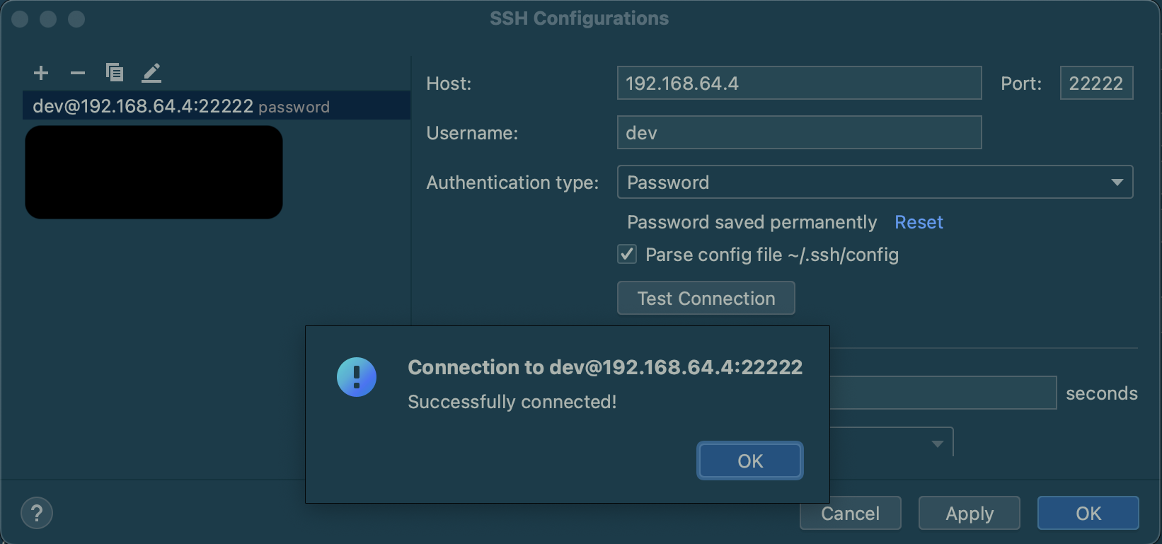'Toolchains'의 SSH 연결 Credentials 설정에서 Host 설정을 'localhost'에서 아래와 같이 Guest OS의 IP로 수정한다. 'Test Connection'를 클릭해 보면 성공할 것이다.
