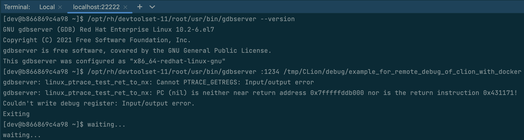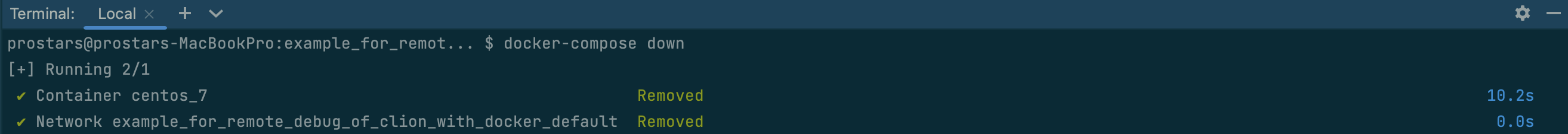 그리고, gdbserver는 실행에 실패하고 종료되었지만, example_for_remote_debug_of_clion_with_docker 프로세스는 실행되고 있으니 직접 kill 해야 하지만 이 컨테이너는 종료할 것이므로 무시해도 괜찮다. 아래와 같이 도커 컴포즈를 종료한다.