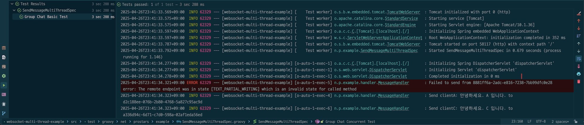 멀티스레드 문제가 발생하려면 최소한 2개의 스레드에서 거의 동시에 하나의 웹소켓 세션에 메시지 전송을 시도 해야 한다.