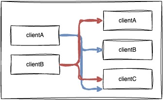 예를 들어 아래와 같이 clientA는 clientB와 clientC에게 보내고 clientB는 clientA와 clientC에게 보내려고 시도한다.